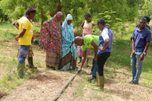 Le volet pratique de la formation s’est déroulé le lendemain, le 30 mai 2024. Après un rappel des éléments théoriques abordés la veille, les participantes se sont rendues dans le jardin pour la mise en pratique des connaissances acquises. Les formateurs ont expliqué l’utilisation des tuyaux et ont démontré comment mettre en marche la colonne de descente. Ils ont ensuite montré aux participantes comment mettre en marche et entretenir les vannes des bandes d’aspersion, ainsi que les étapes d’installation, de désinstallation et de nettoyage des bandes. Chaque participante a eu l’opportunité de monter et démonter une vanne, un té, ainsi que de placer une bande et un collier, avec l’assistance des formateurs.